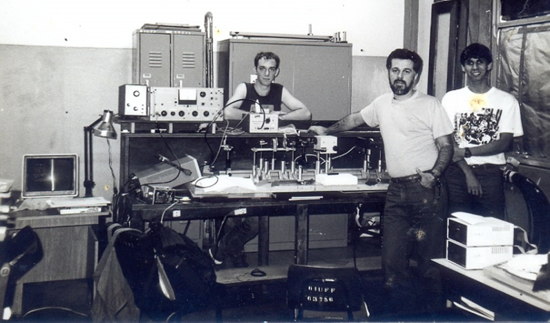 Laboratório de Fibras Óticas do TET/UFF em 1988, uma das iniciativas que deu origem ao PPGGET. Na foto, a prof. Hypolito José Kalinowski à frente dos profs. Andrés Pablo Lopez-Barbero e Tarcísio Martins Dantas, então estudantes em Iniciação Científica. Na bancada, um amplificador lock-in valvulado, de meados da década de 1950, um controlador de modulador fotoelástico e computadores Apple IIe, que permitiam digitalizar sinais através da porta de joystick (analógico).